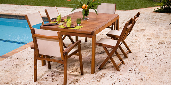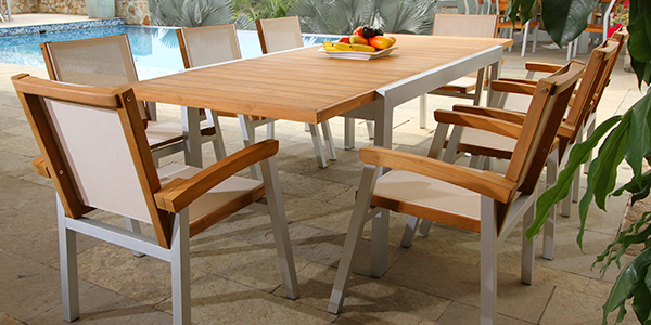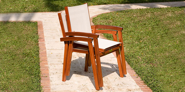 Silla apilable del conjunto de muebles de la Línea Japón en Aluminio y madera Teca aceitada o Teca lacada. En su fabricación se usa la malla.